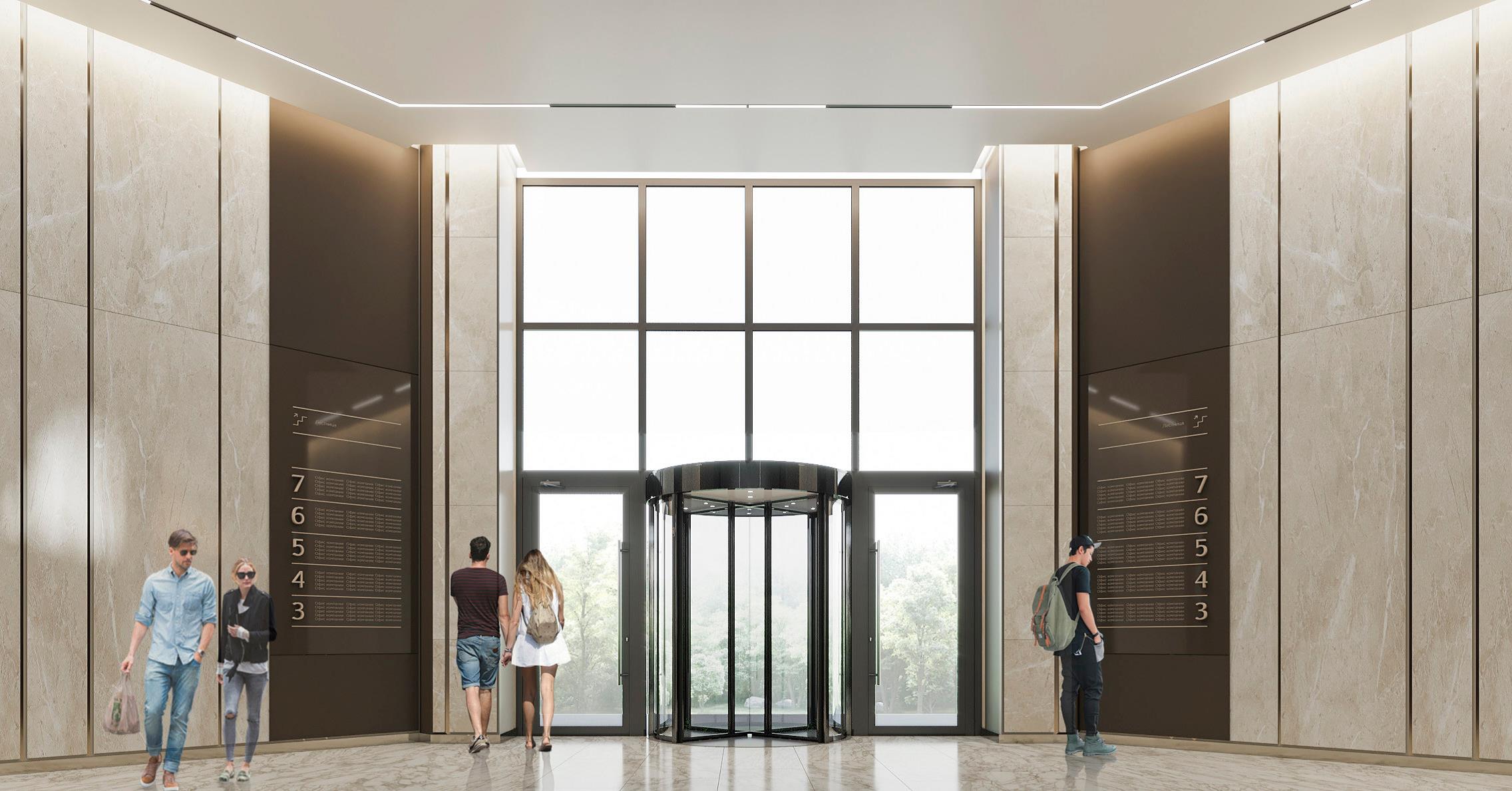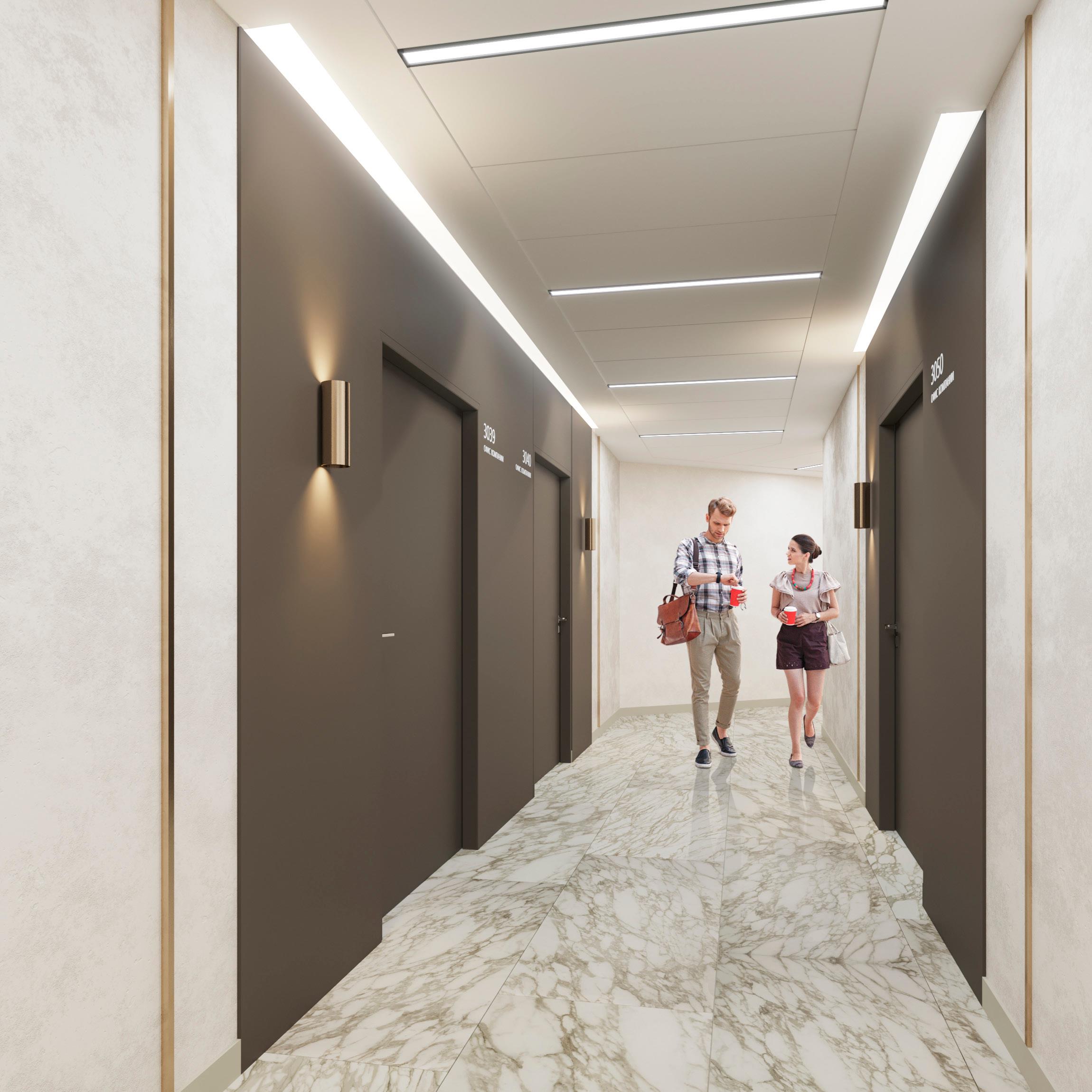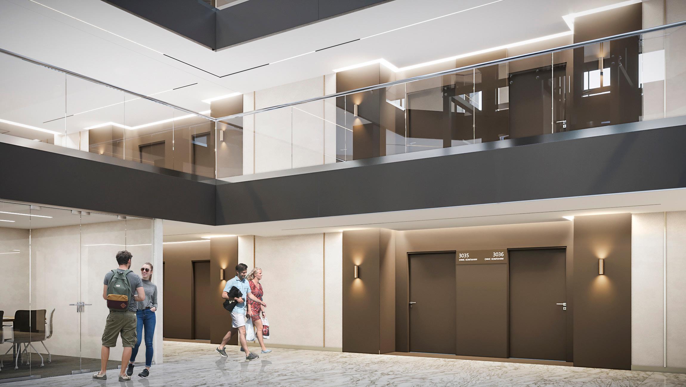 Офисные помещения расположены с 3 по 7 этажи, общая площадь равна 7500 квадратных метров, рассчитанных на 150 офисов и 1500 человек.